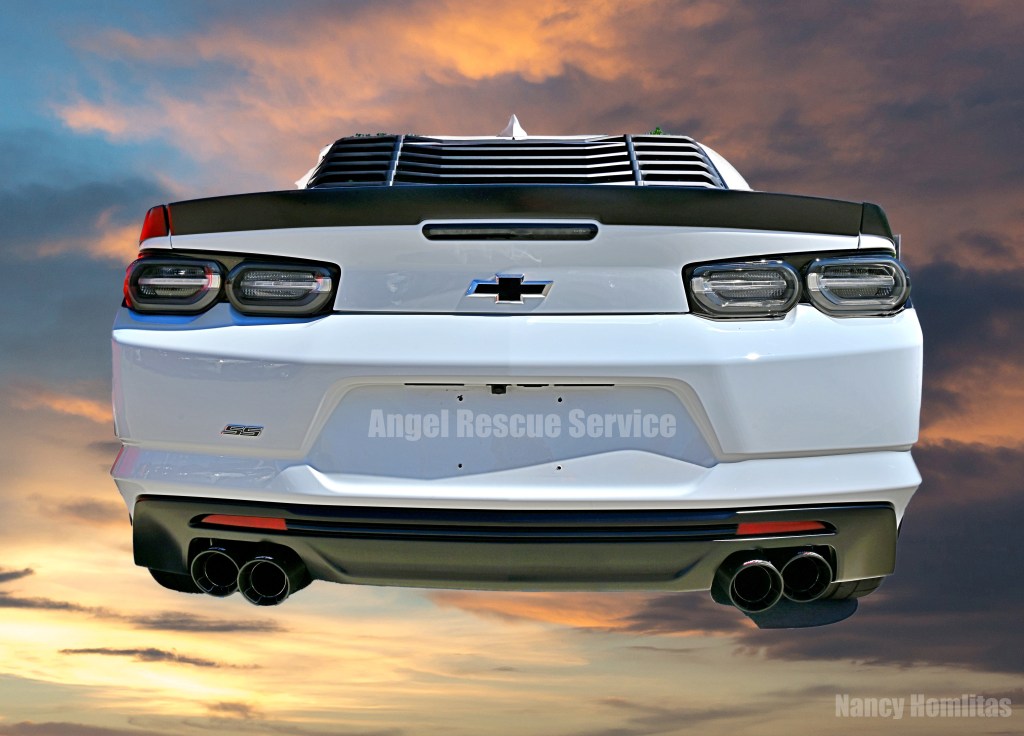 I glorify God and his angels for answering my prayers and for sending a burnout master in a butt-kicking machine to rescue me. Hopefully, my earthly angel will learn to bridle his powerful Camaro SS dream car before running over any chickens.