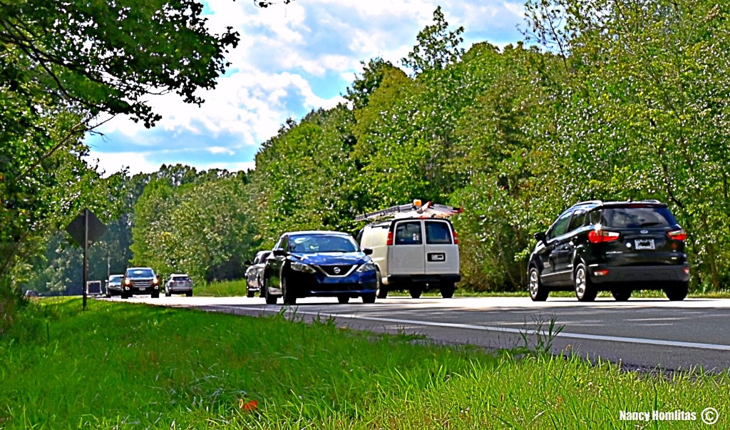 The speed limit is 55 miles per hour. Since state troopers frequently patrol the highway, most local drivers will roll along inconspicuously at sixty mph. This stretch of road has no shoulders, only bordering ditches and an occasional pull off area. It’s not unusual to have to coast around a cruiser with its lights flashing behind a traffic violator whose car is slanting with the pitch of the ditch.